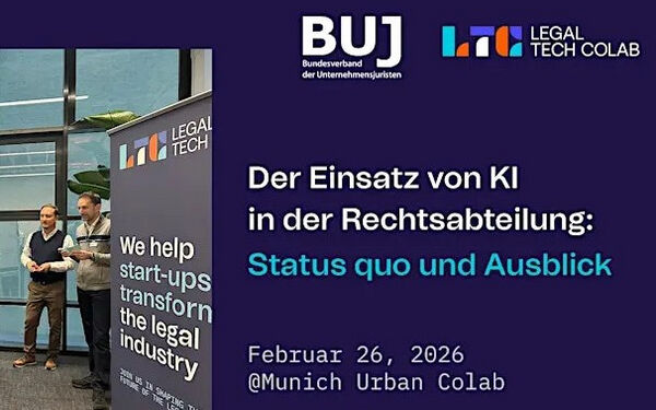 Das Legal Tech Colab München lädt gemeinsam mit der Regionalgruppe München des Bundesverbandes der Unternehmensjuristinnen und Unternehmensjuristen (BUJ) herzlich zu einem praxisorientierten Abend rund um den Einsatz von Künstlicher Intelligenz in Rechtsabteilungen ein. Im Fokus stehen konkrete Anwendungsbeispiele aus der Unternehmenspraxis, strategische Einordnungen aus dem Konzernumfeld sowie innovative Lösungen aus dem Legal-Tech-Ökosystem.